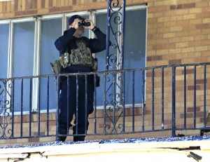 A police officer uses binoculars across from the Muhammad Mosque to monitor the situation. (Jae S. Lee/Staff Photographer)